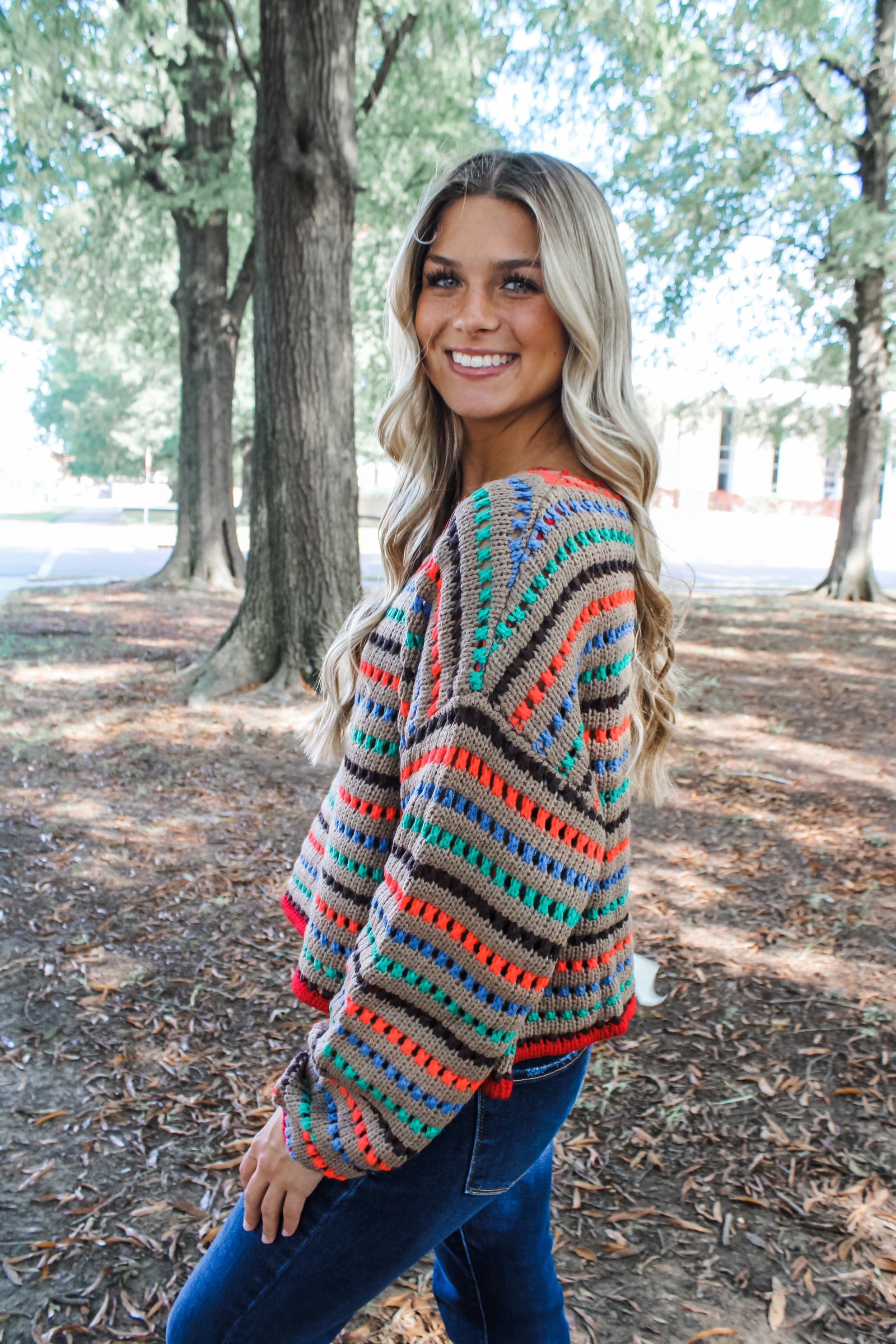 We’re seeing stripes! This super cute sweater is a playful look to refresh your fall wardrobe! Crocheted with an open knit pattern, multicolor design and contrast finishing for a stylish flair. Featuring a crew neckline, relaxed slouchy silhouette and drop shoulder sleeves. Layer with a basic knit or cami.