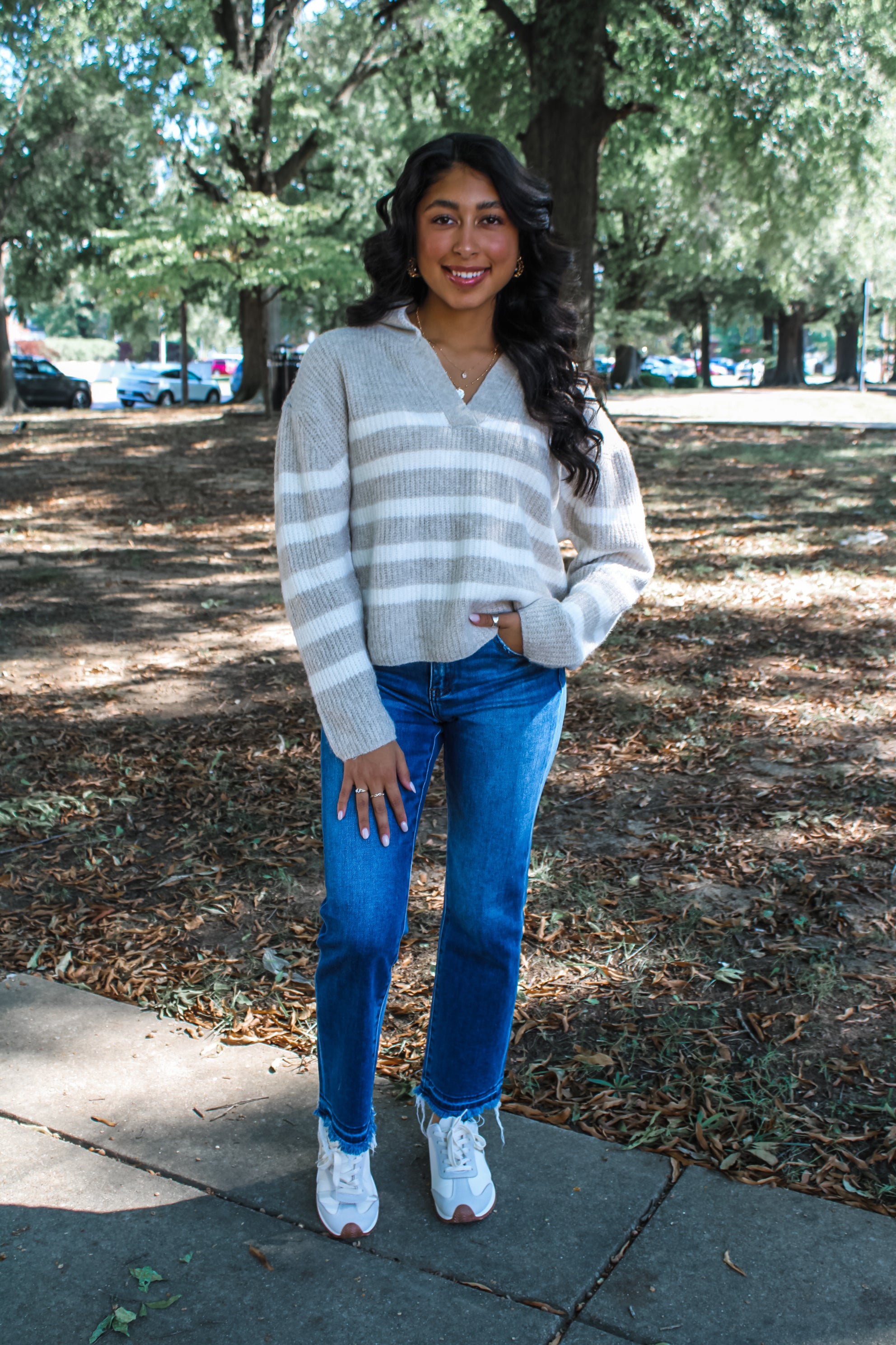 So cozy and chic, this striped sweater is featured in a slouchy silhouette for the comfiest fit. The heather knit fabrication provides a layer of warmth that’s soft to the touch, while the collared neckline gives it a preppy feel. Featuring a v-neckline with stitch trim detailing, drop shoulder sleeves and rib contrast finishing.