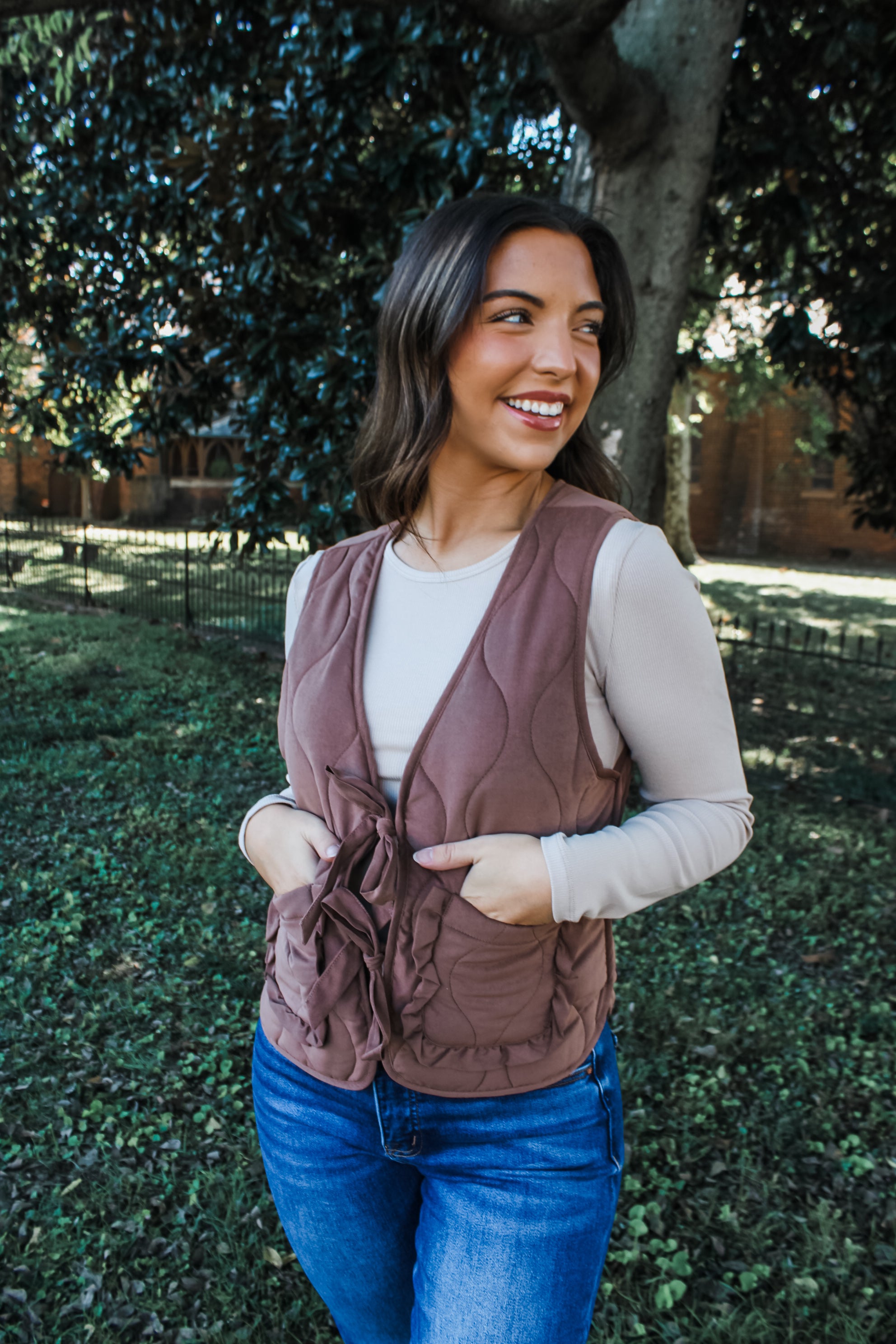Elevate your wardrobe with effortless layers and cozy charm. Crafted from a quilted fabrication, this sweet vest is a versatile look with many styling possibilities. Featuring an open front with a bow tie closure, double pockets with ruffle trim detailing, and an easy fit for style and layering.