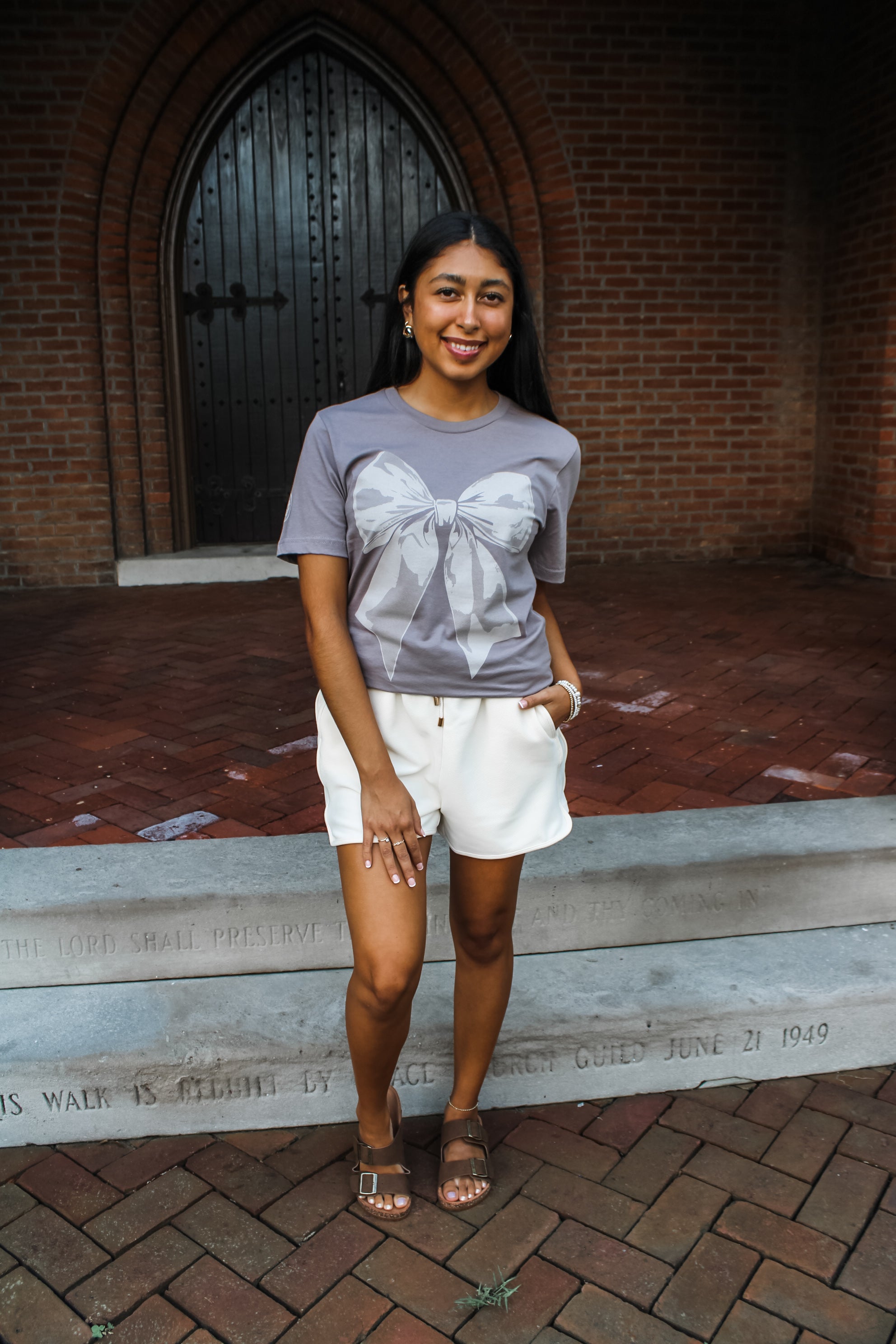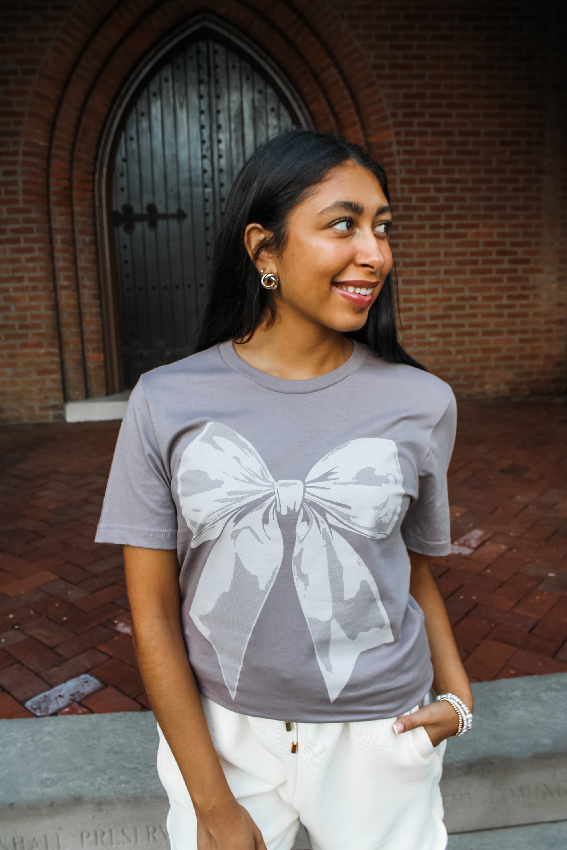 Refresh your fall style with this cute and trendy bow print tee! Worn on its own or layered under overalls and shackets, it’s a playful look that adds print and personality to your everyday style. With a classic crewneck and relaxed fit in a soft, pre-shrunk cotton knit.