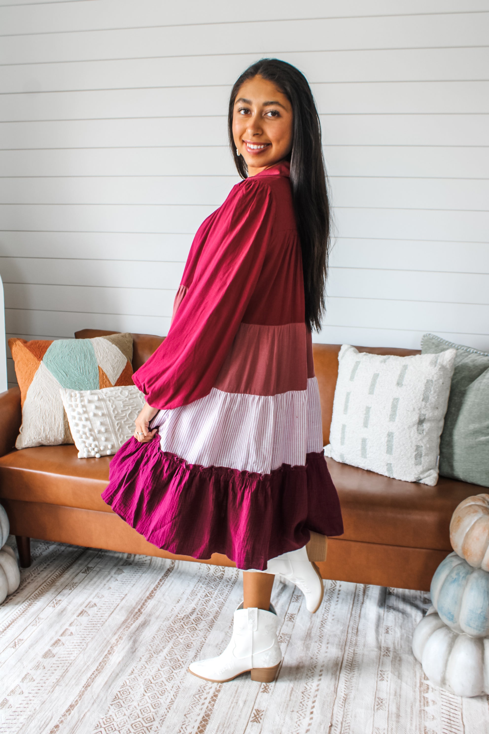 Styling tips: It’s an eye-catching one-and-done look you can dress up with heels and statement added for family events, pair with flats and a tote for Sunday brunch, or wear with ankle boots and a fedora hat for fall gatherings.