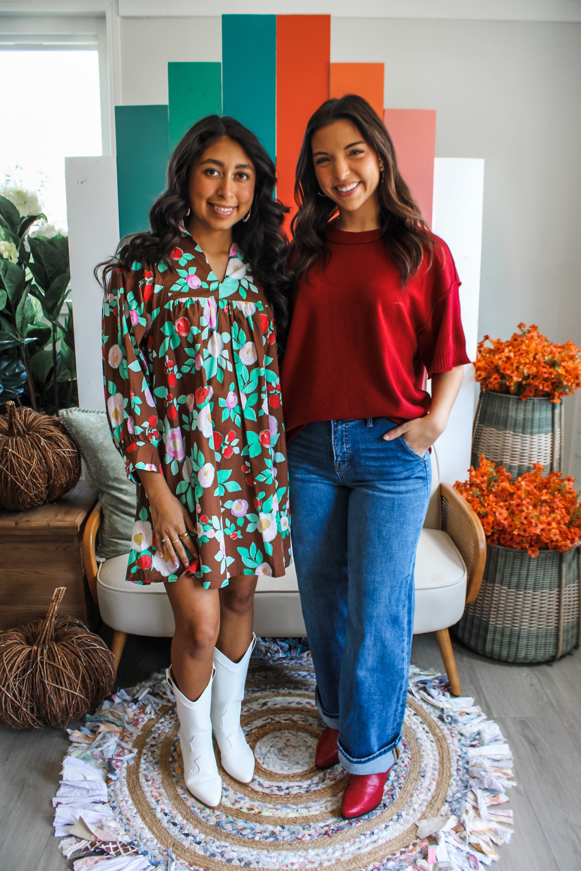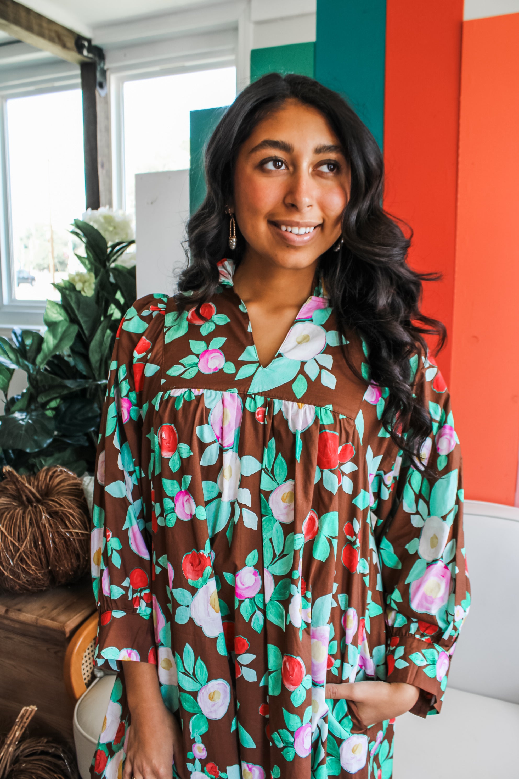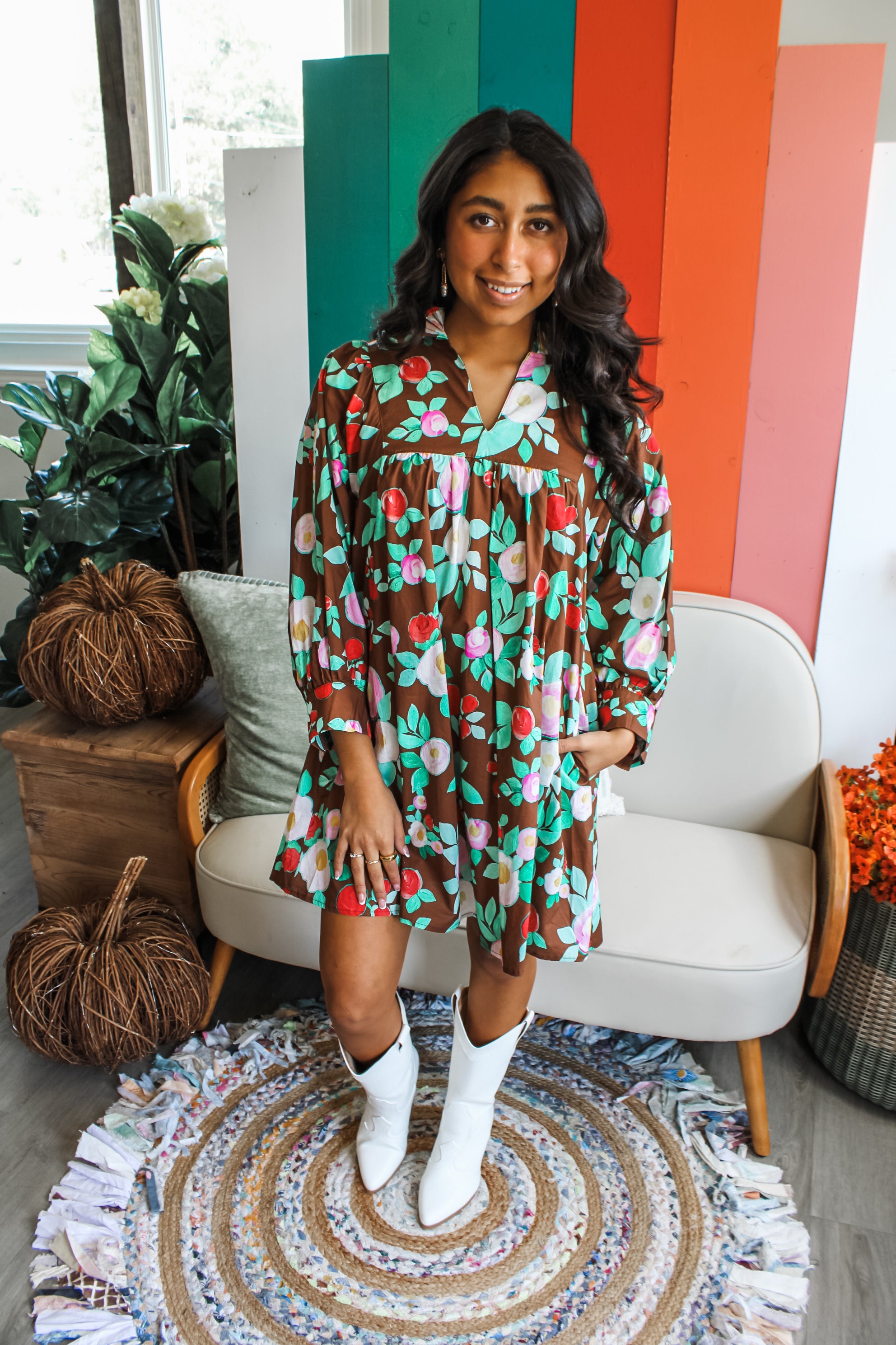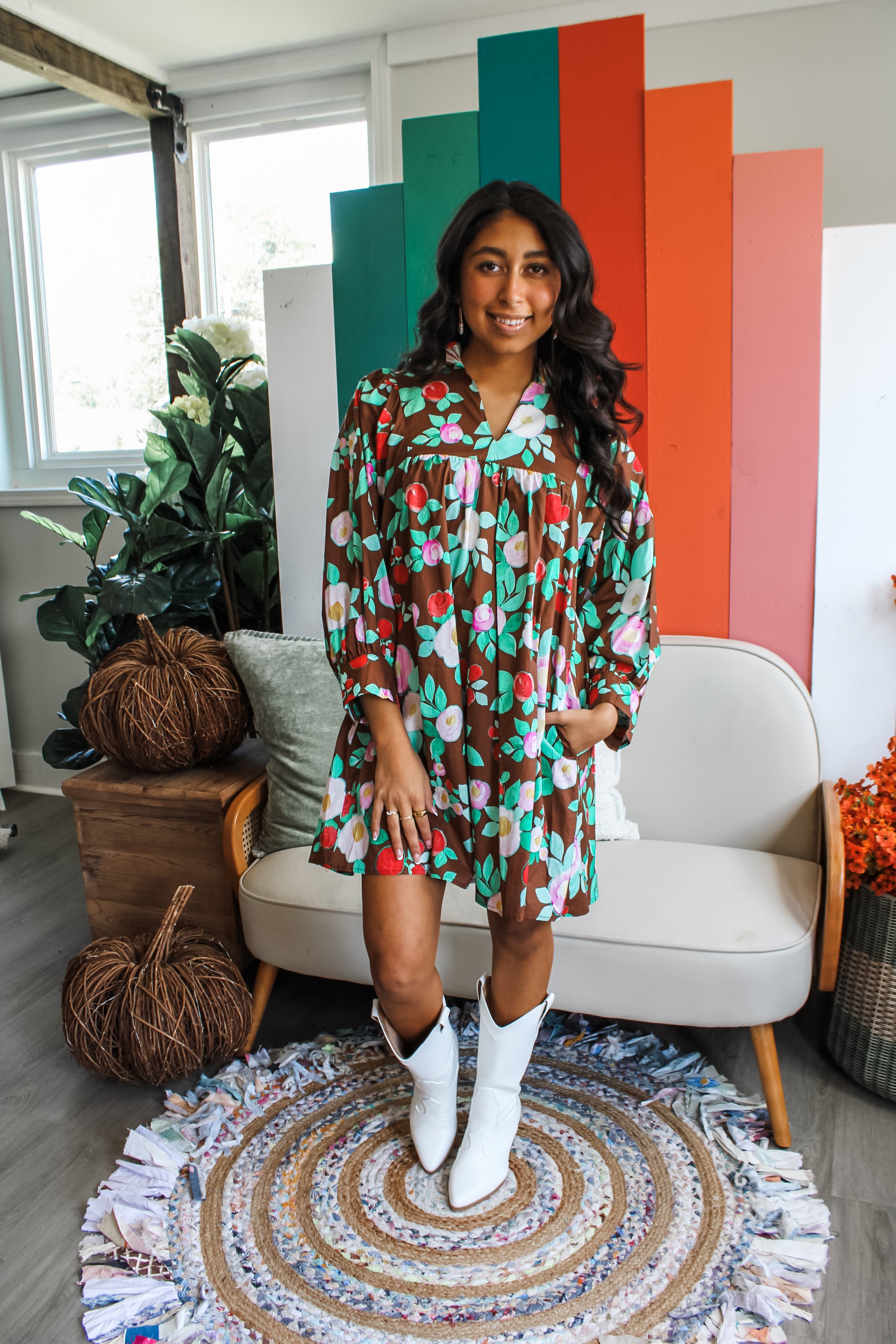 Floral dresses for a striking fall style. This printed beauty is an effortless and eye-catching look you can dress up or down. Crafted in a lightweight woven with a breezy a-line silhouette for a look that moves with you. Featuring a ruffle trim notched neckline, balloon sleeves and a flowy hem.