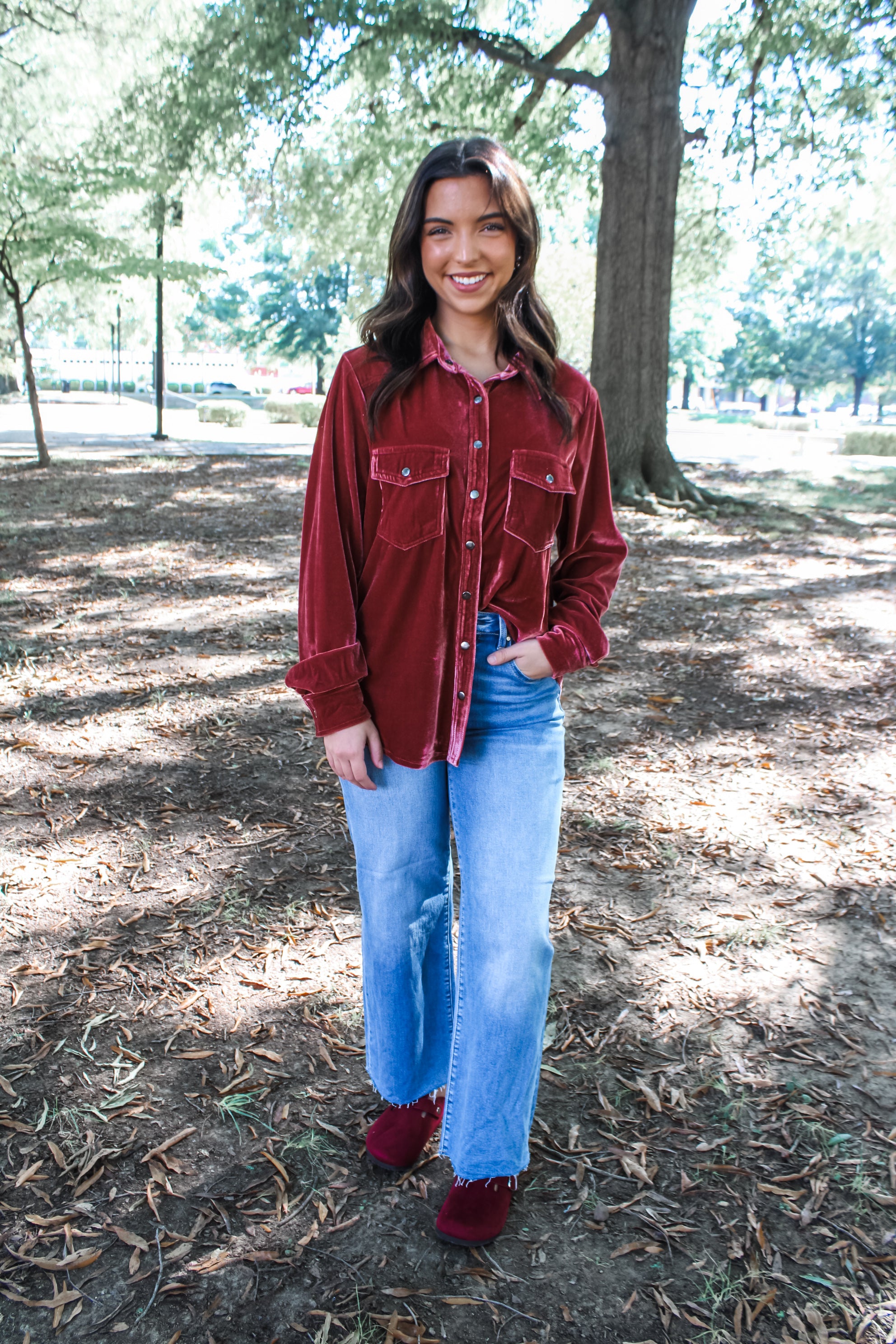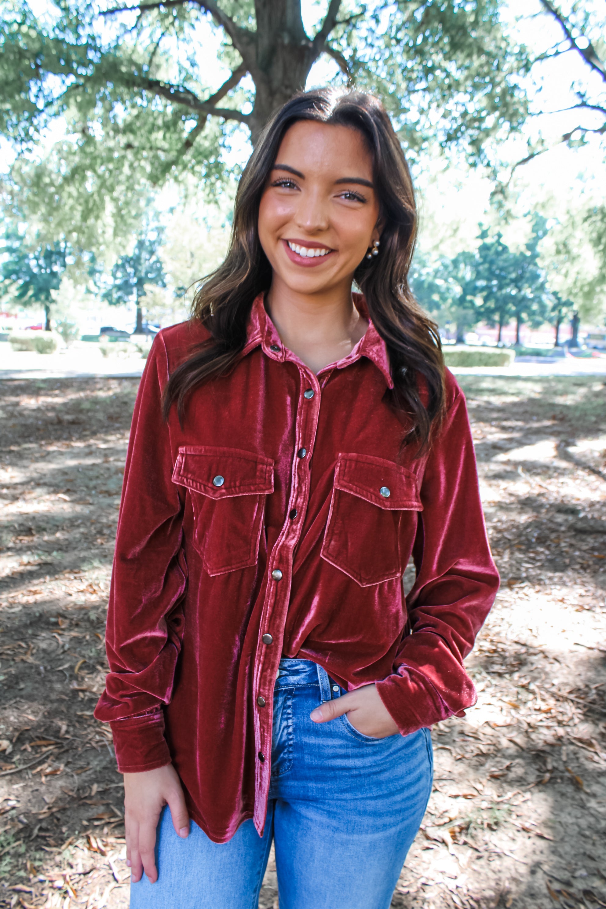 Meet our Velvet Dreams Button Down – a versatile piece that evokes easy elegance. Featured in a relaxed silhouette for an easy and flattering fit, with a collared neckline, double patch pockets and snap button closure. The luxe fabrication provides a rich tone and beautiful sheen, for a look that will always make a statement.