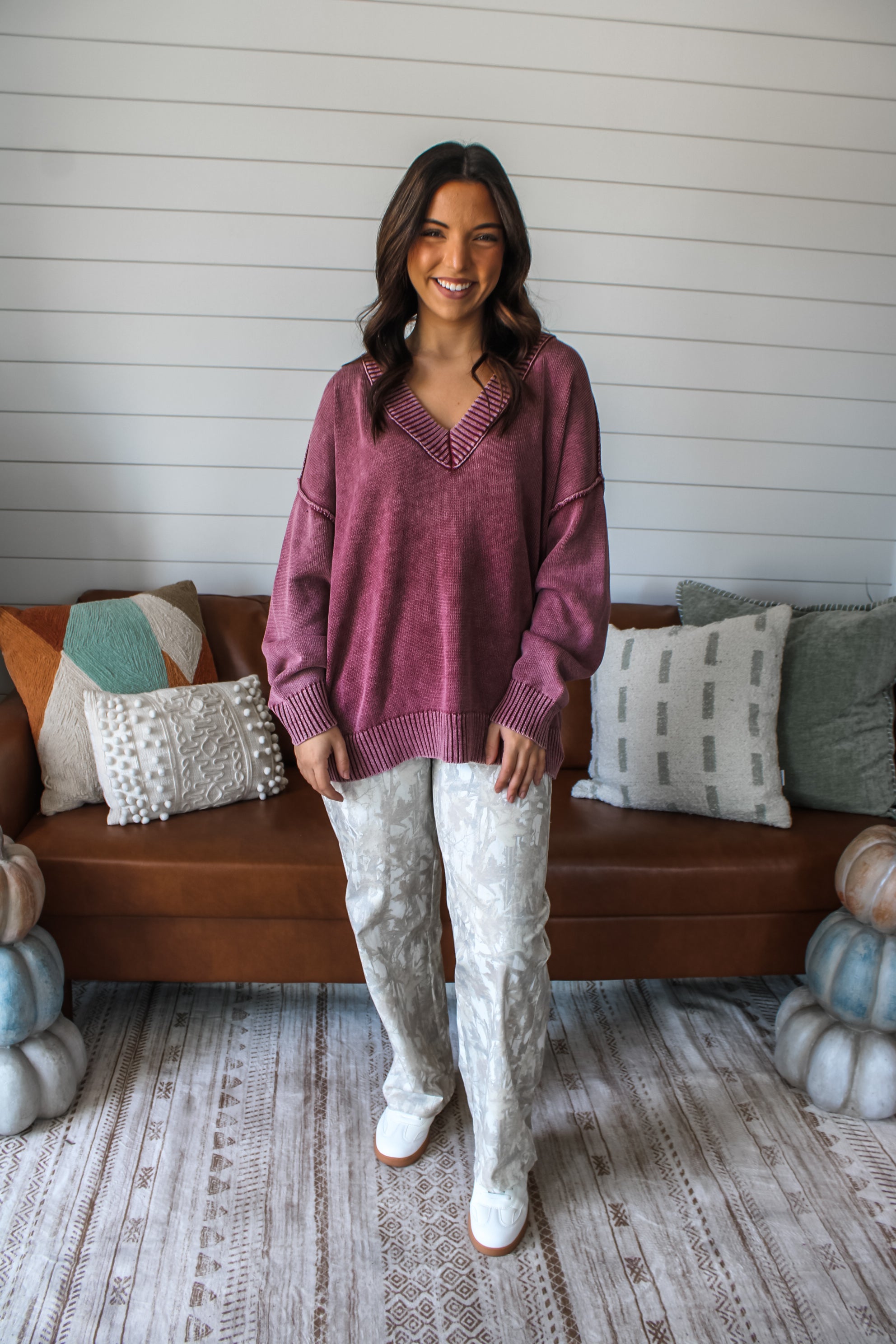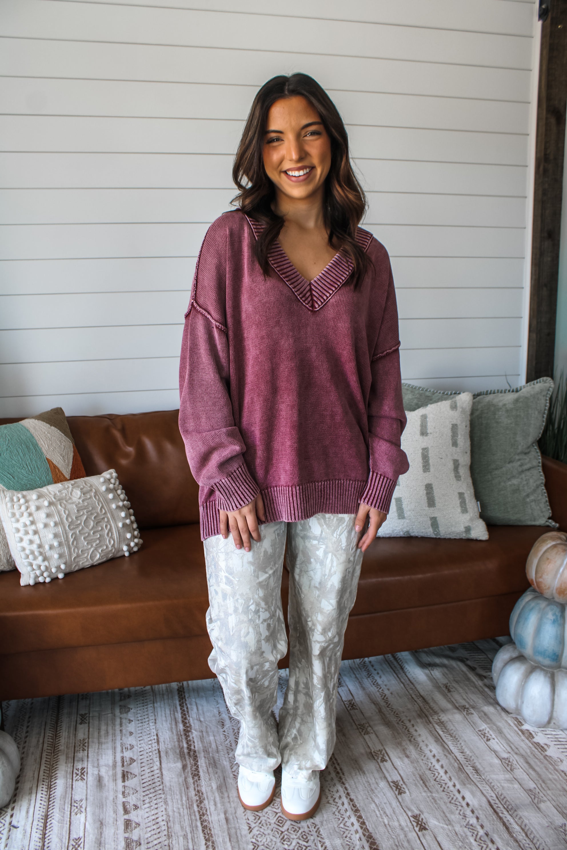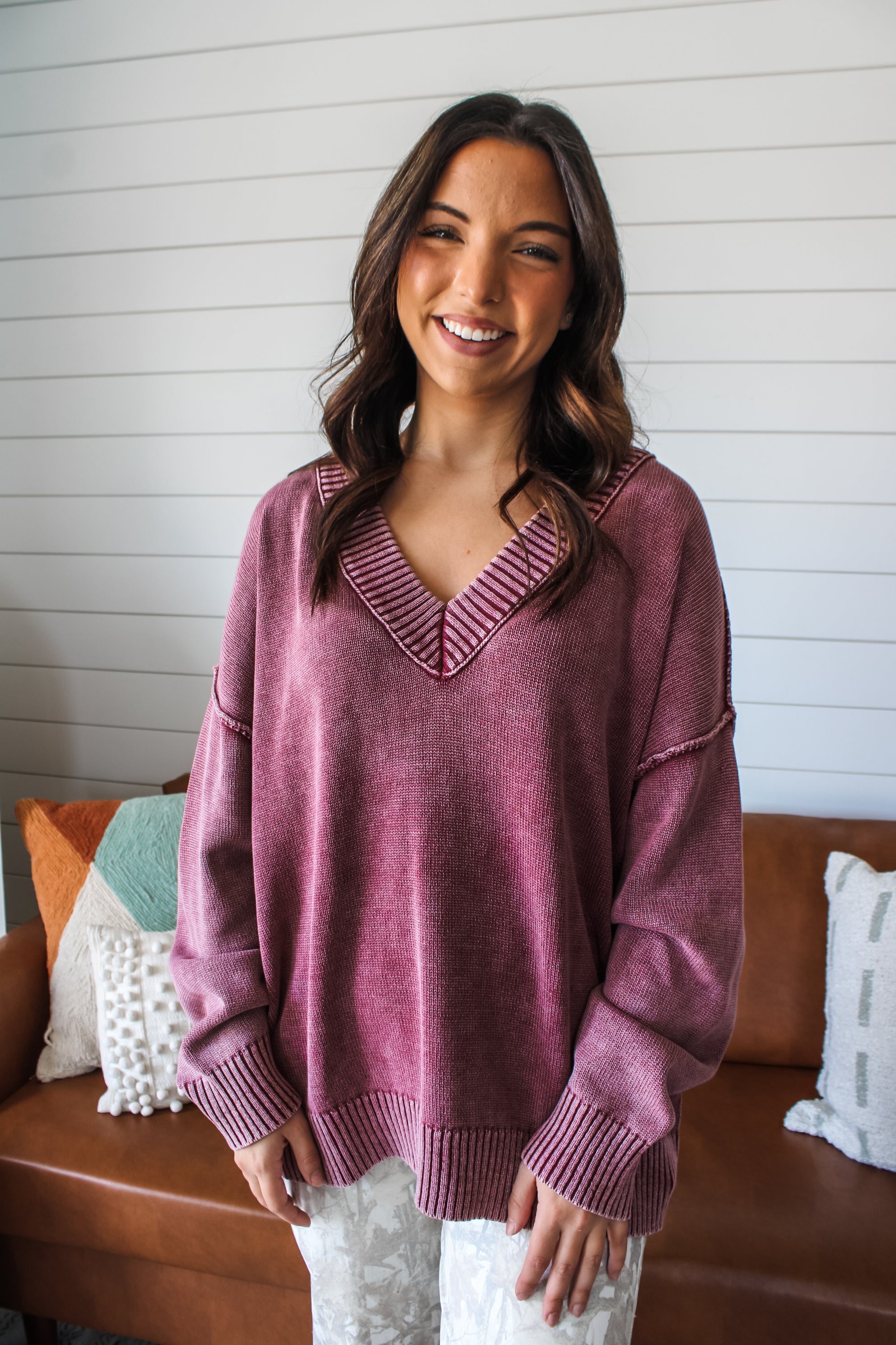 So cool and oversized, this v-neck sweater is a must-have you'll wear on repeat! Crafted from a garment dyed knit for a vintage-inspired edge that’s both timeless and trendy. Featured in a slouchy dolman-inspired silhouette with drop shoulder sleeves, exposed seaming and contrast rib finishing.
