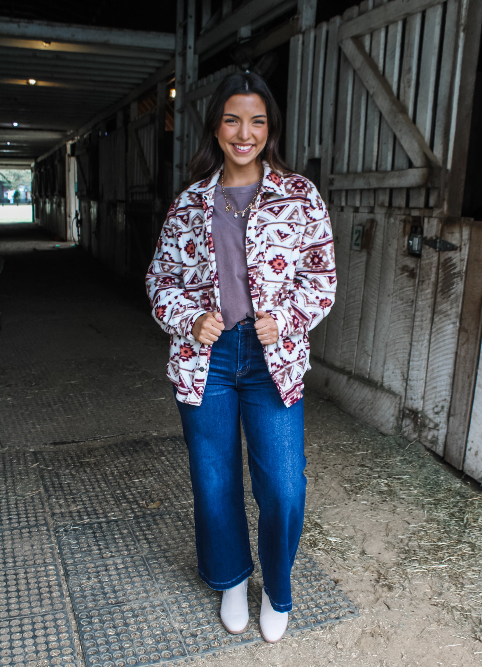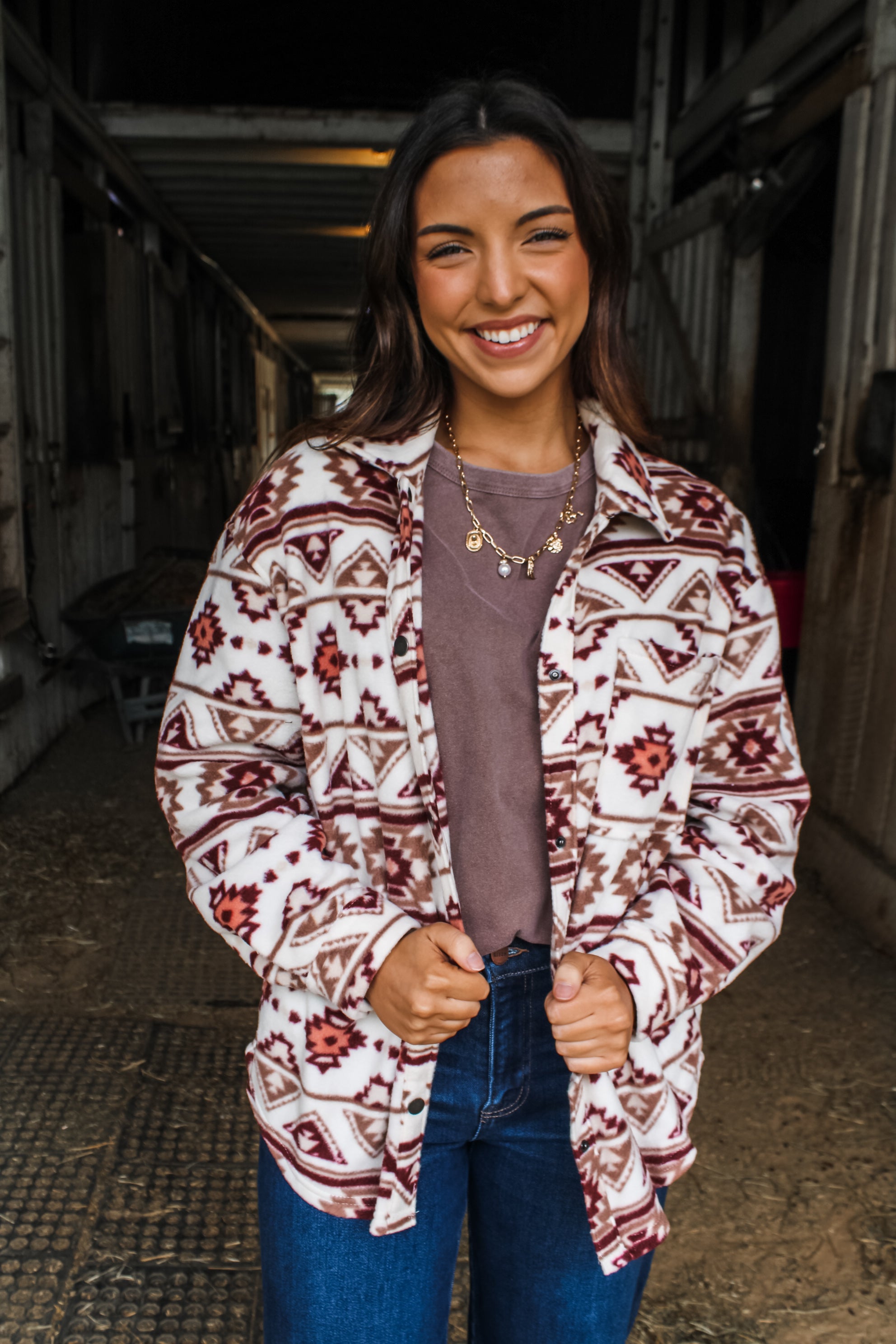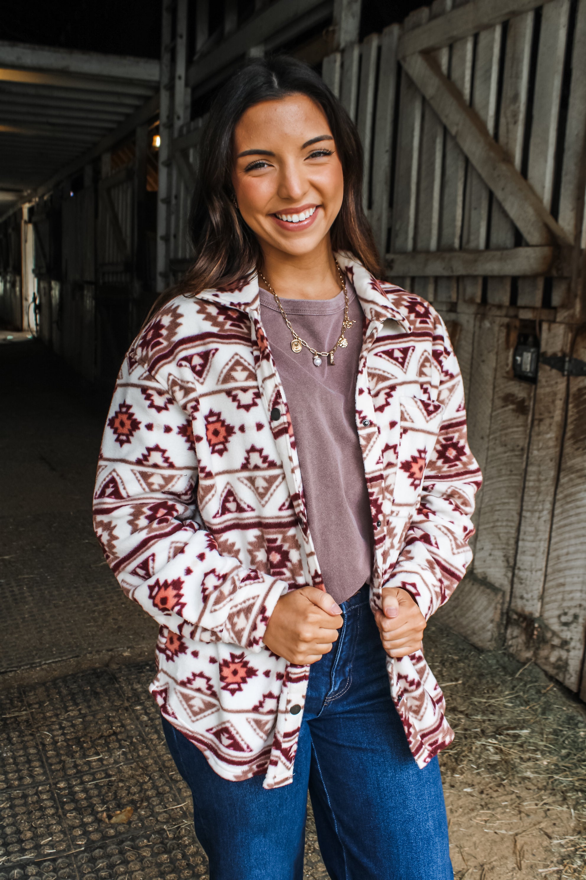 Perfect for throwing on and heading out, this aztec print shacket comes in a soft fleece fabrication for a layer of warmth with the coziest feel. Featuring a collared neckline, snap button front, chest pocket detail and a curved hem. Essential for layering, this eye-catching style pairs perfectly with all your favorite basics and graphic tees.