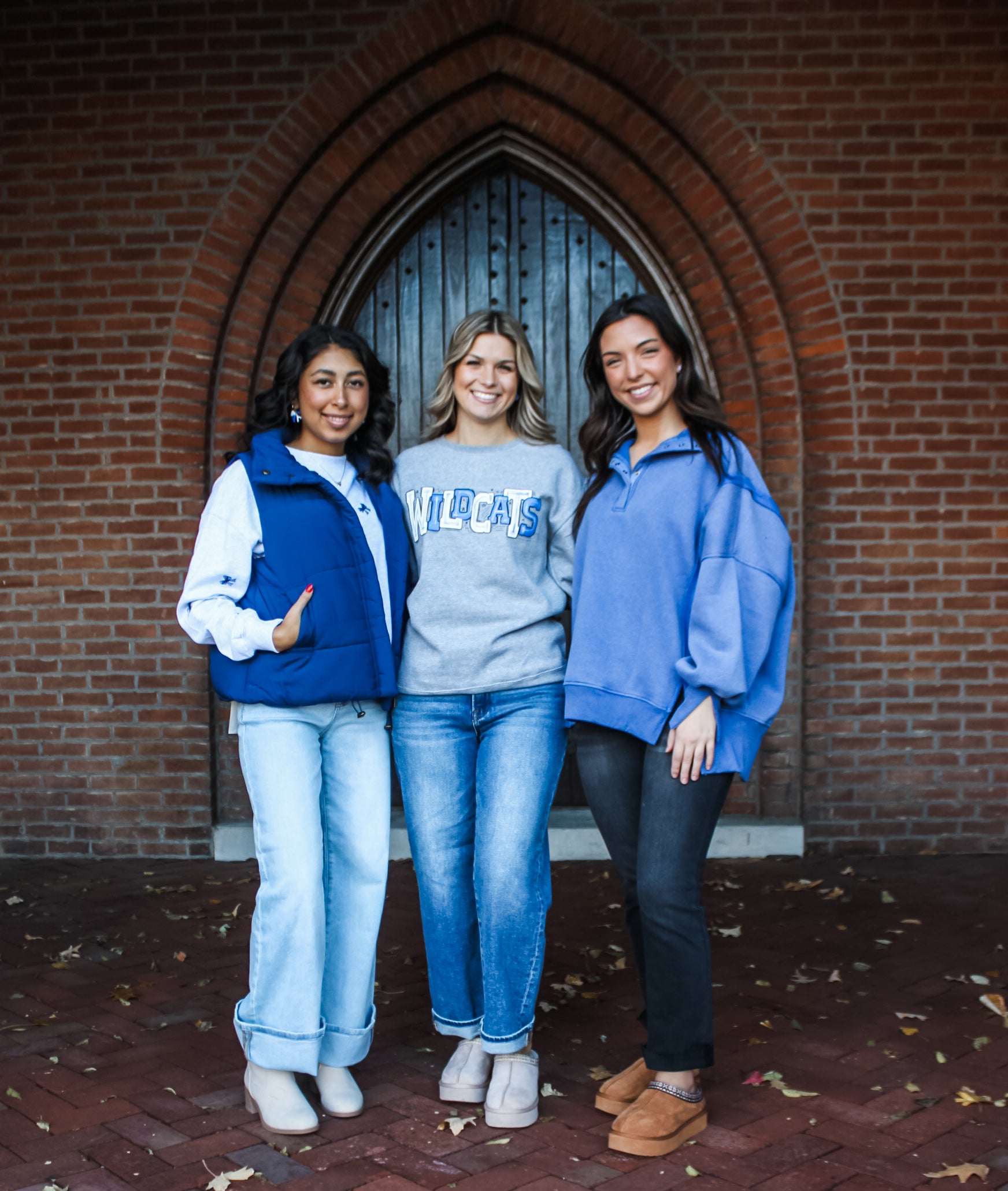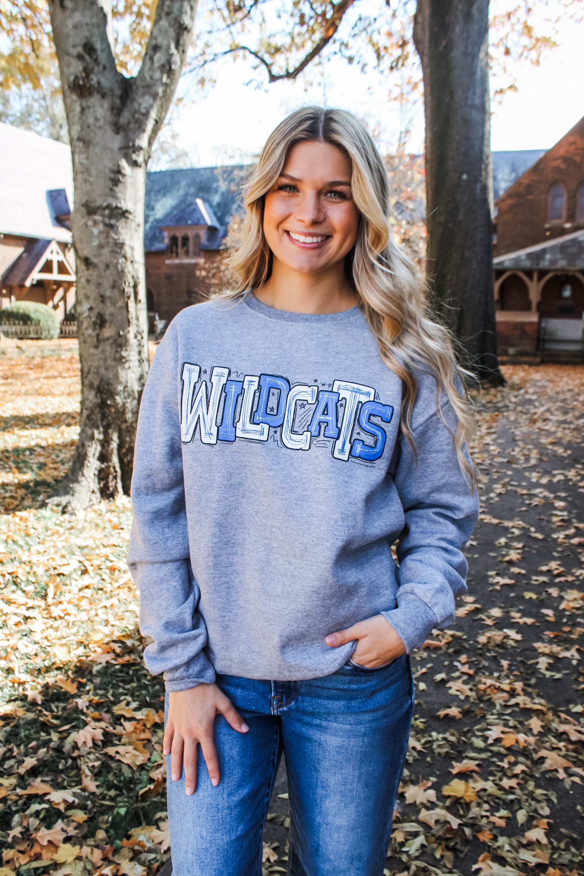 Have a Wildcat Christmas! Our exclusive collection of the cutest graphic sweatshirts will keep you cozy and comfy all season long! This crewneck pullover features a graphic print in soft pre-shrunk fleece, with drop shoulder sleeves and a relaxed fit. With ribbed cuffs, collar and waistband with spandex for stretch and recovery. Toss over leggings or wear with your favorite jeans. Unisex fit, S-2X. Gildan Heavy Blend. 50% Cotton, 50% Polyester. Model is 5’3” and wears Small.