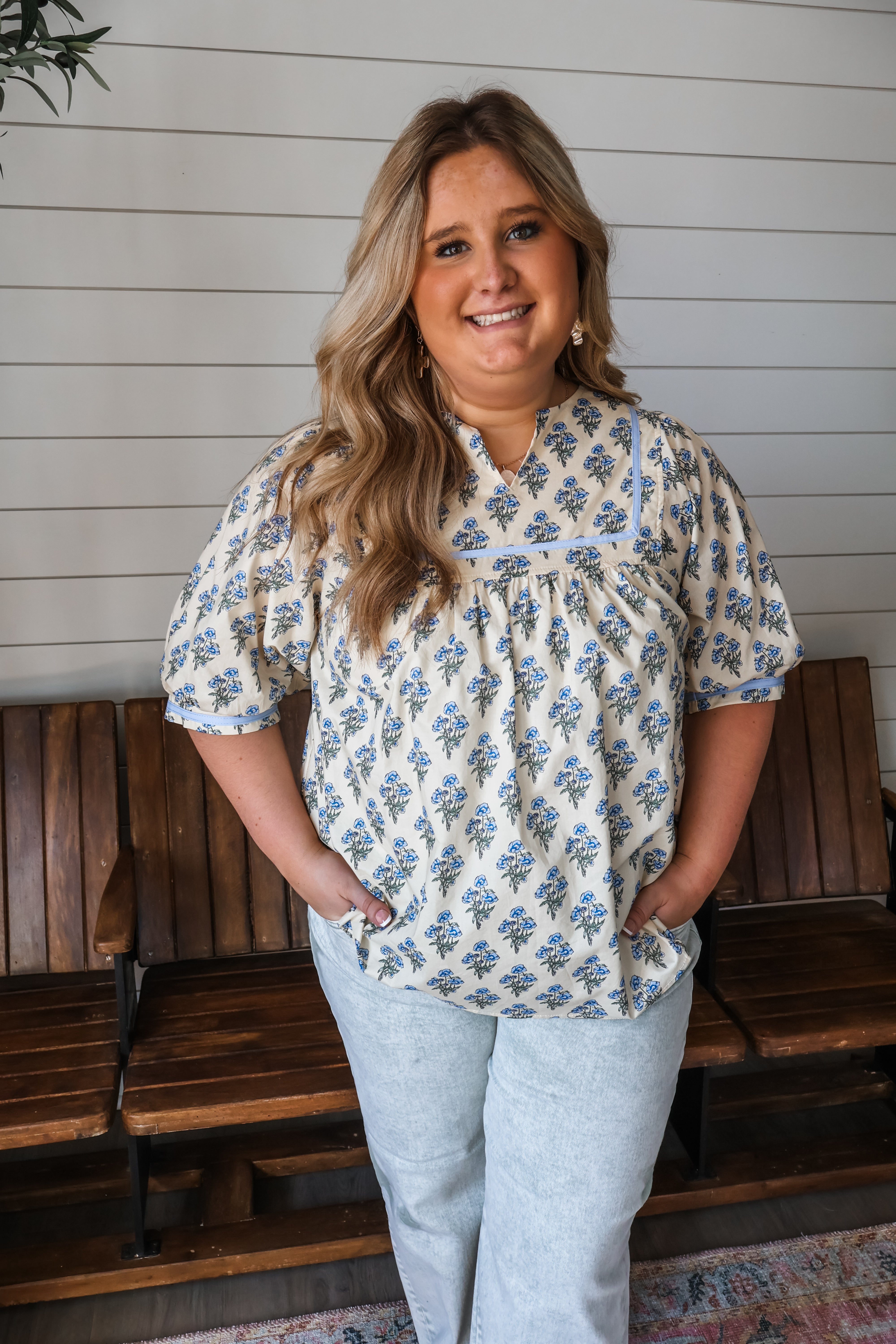 Fresh florals for a sophisticated spring style. This blouse combines a charming print with contrast piping trim details for a pretty and polished look. The billowy puff sleeves is so on-trend and the flowy silhouette provides an easy flattering fit. Crafted from a lightweight cotton woven with a notched v-neckline and ruffle hem.